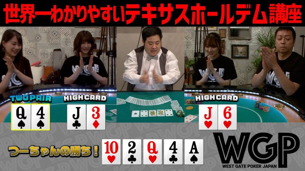 最終的に残っているプレイヤー同士で場の5枚、手持ちの2枚のカードの合計7枚のうち、5枚でポーカーの役を作り、誰が強いかで勝敗が決定します。勝ったプレイヤーが、今までの賭けで貯まったチップを獲得します。途中で自分以外のプレイヤーが全て降りてしまった場合も残ったプレイヤーが勝ちとなります。